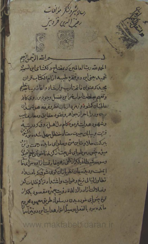 آغاز : ...که بمفتاح دلگشای این تسمیه و تحمید یعنی دو فقره طیبه از ام الکتاب قرآن مجید ...